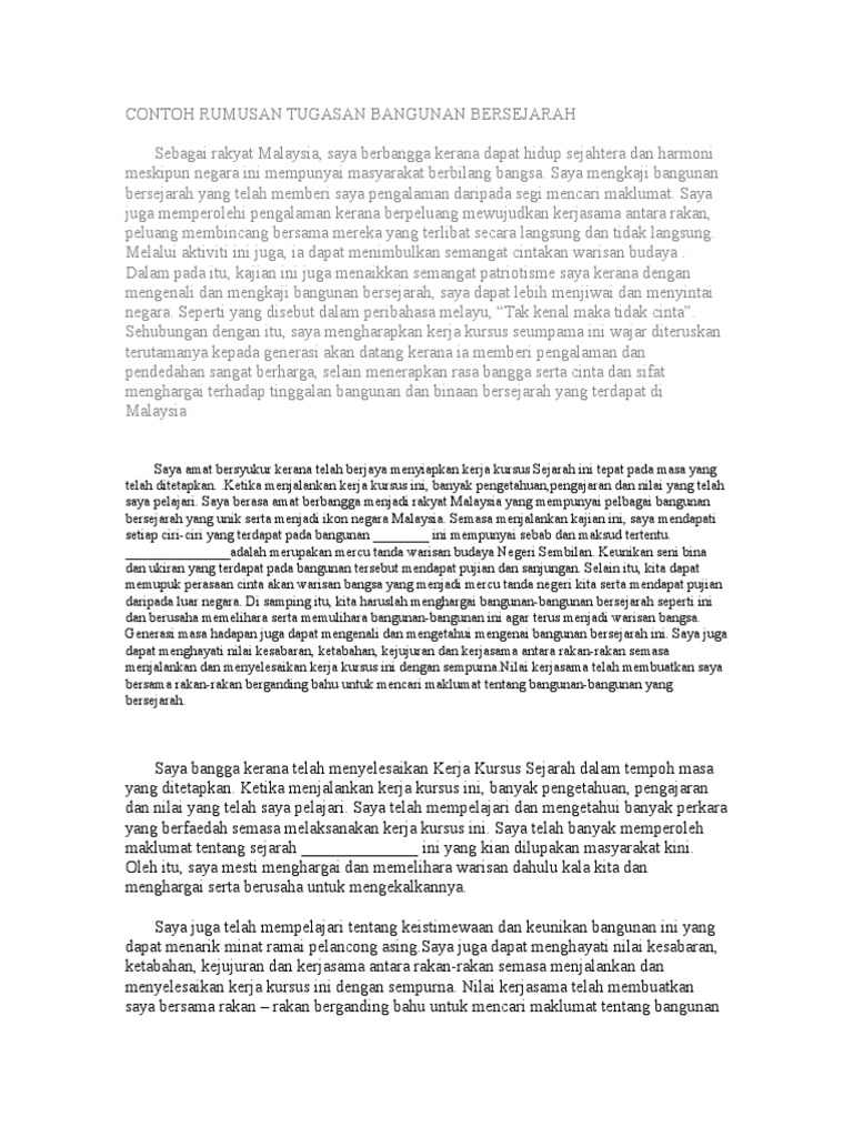 Rumusan from imgv2-1-f.scribdassets.com Contoh rumusan untuk tugasan / kerja kursus sejarah pt3 2018. Contoh rumusan untuk tugasan / kerja kursus sejarah pt3 2018. Download contoh penulisan kerja kursus sejarah stpm penggal 2.doc. Berikut dikongsikan contoh rumusan bangunan bersejarah untuk panduan pelajar tingkatan 3 dalam menyiapkan kerja kursus sejarah pt3 2016. Contoh jawapan kerja kursus sejarah pt3 2020|anda calon menduduki peperiksaan pt3 tahun 2020? Dalam membuat karya tulis, rumusan masalah merupakan salah satu bagian penting yang harus diperhatikan. Use the download button below or simple online reader. Rumusansaya amat bersyukur kerana telah menyelesaikan kerja kursus sejarahdalam tempohmasa yang ditetapkan.ketika menjalankan kerja kursusini,banyak pengetahuan,pengajarandan nilai yang telah saya pelajari.selepasmenjalankan kerja kursus.