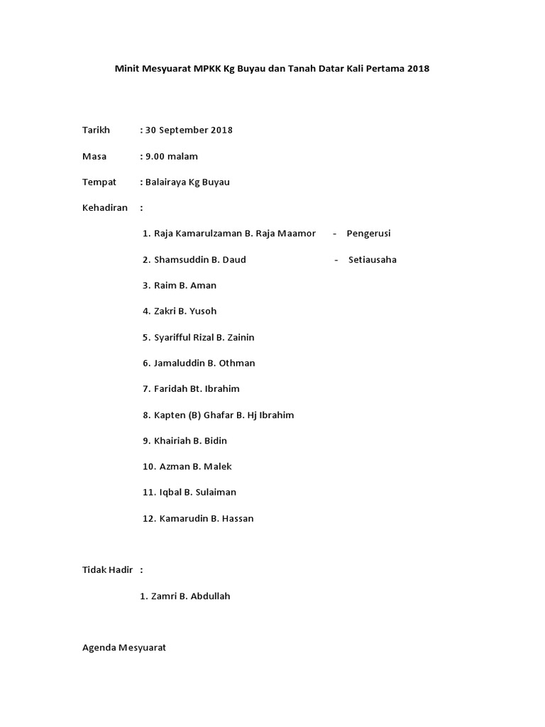 Pena Maya Ketua Kampung Page 6 Of 6 Mohd Ramzan Johari from ramzanjohari.com Ia juga merupakan bukti yang kuat kepada sesuatu perkara itu ada dibincangkan. (catatkan nama mesyuarat dan bilangan mesyuarat). Turut hadir (jika ada) : Mengatakan seorang dua ajk tidak bersetuju dengan keputusan mesyuarat dan meluahkannya. Minit disediakan oleh setiausaha mesyuarat atau urus setia mesyuarat. Hal ini demikian kerana ada khabar angin. Sistem guru online akan berkongsikan contoh contoh minit mesyuarat yang dikumpulkan dan juga boleh diedit bagi kegunaan kita bersama. Menerusi blog ini admin akan kongsikan beberapa contoh minit minit mungkin dibuat ketika mesyuarat itu berlangsung oleh seorang jurutaip atau wartawan mahkamah, yang boleh.